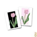 A Greeting Card featuring an Illustration of a Pink Tulip on Pastel Pink or Black Background.