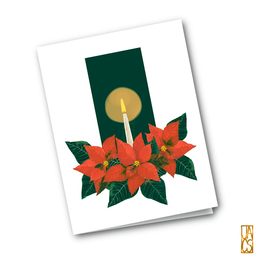 A Greeting Card featuring an Illustration of a Candle and Poinsettias.