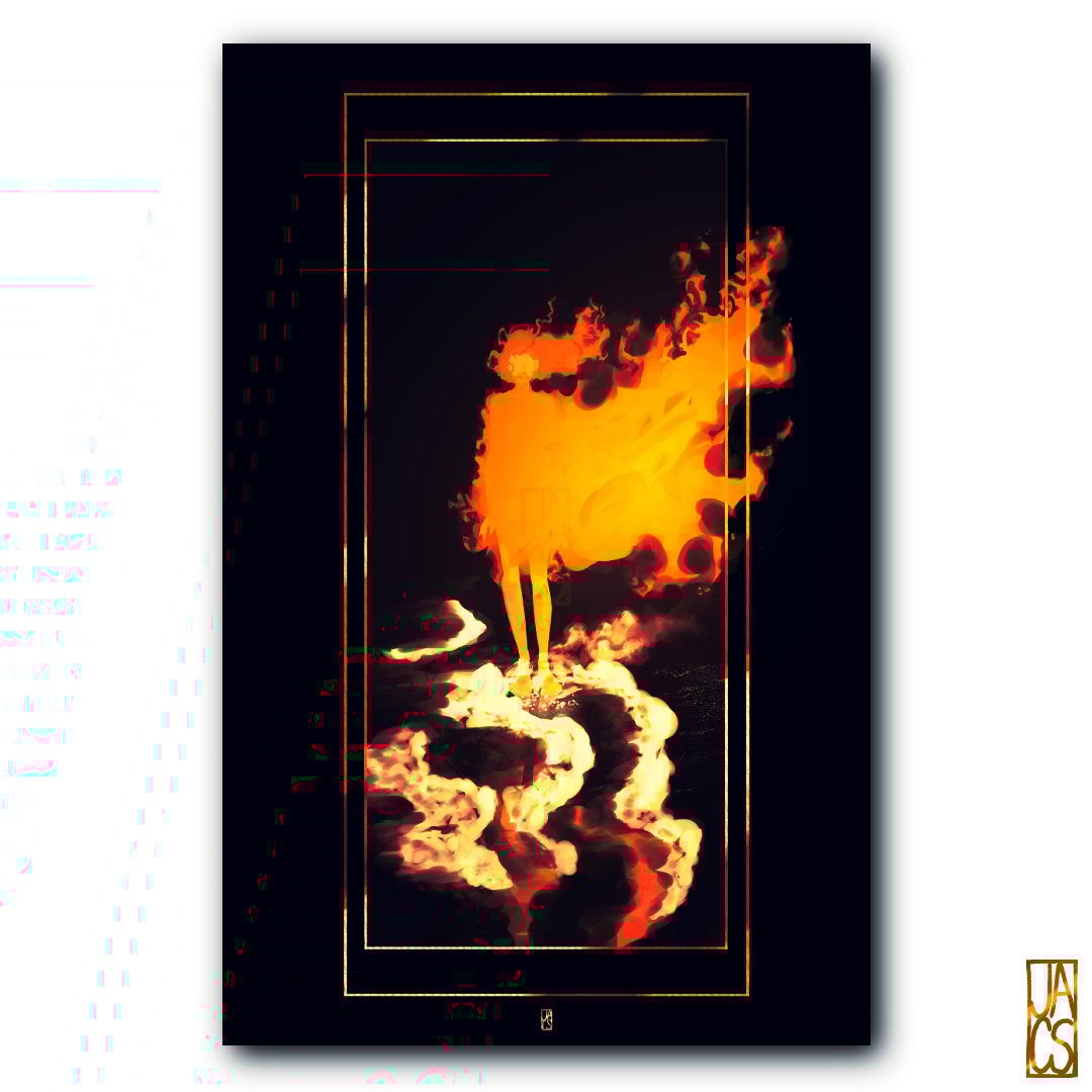 A figure cloaked in flames stands on the shore at night.