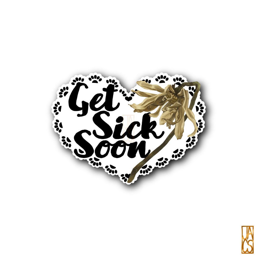 Sticker in the shape of a heart doily, with dead flower, and text, "Get Sick Soon".
